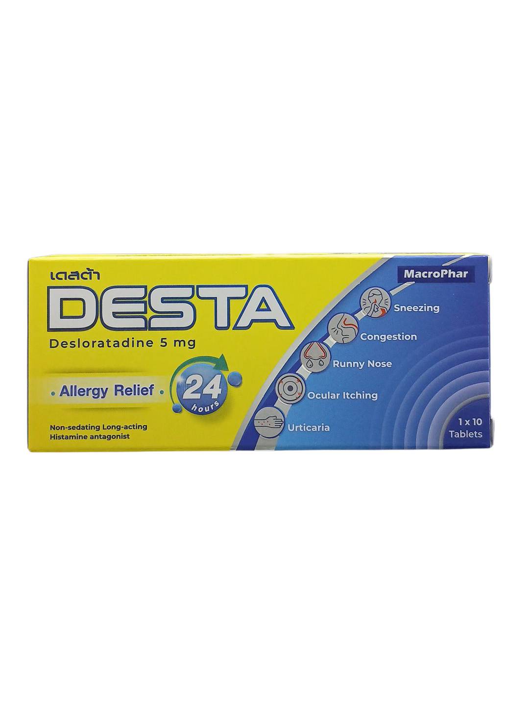 Desta 5 mg เป็นยาแก้แพ้ (Antihistamine) รุ่นที่ 3 บรรจุ 10 เม็ด ใช้เพื่อบรรเทาอาการแพ้ คัดจมูก น้ำมูกไหล จาม คันตา และลมพิษ ภายใต้คำแนะนำของแพทย์หรือเภสัชกร
