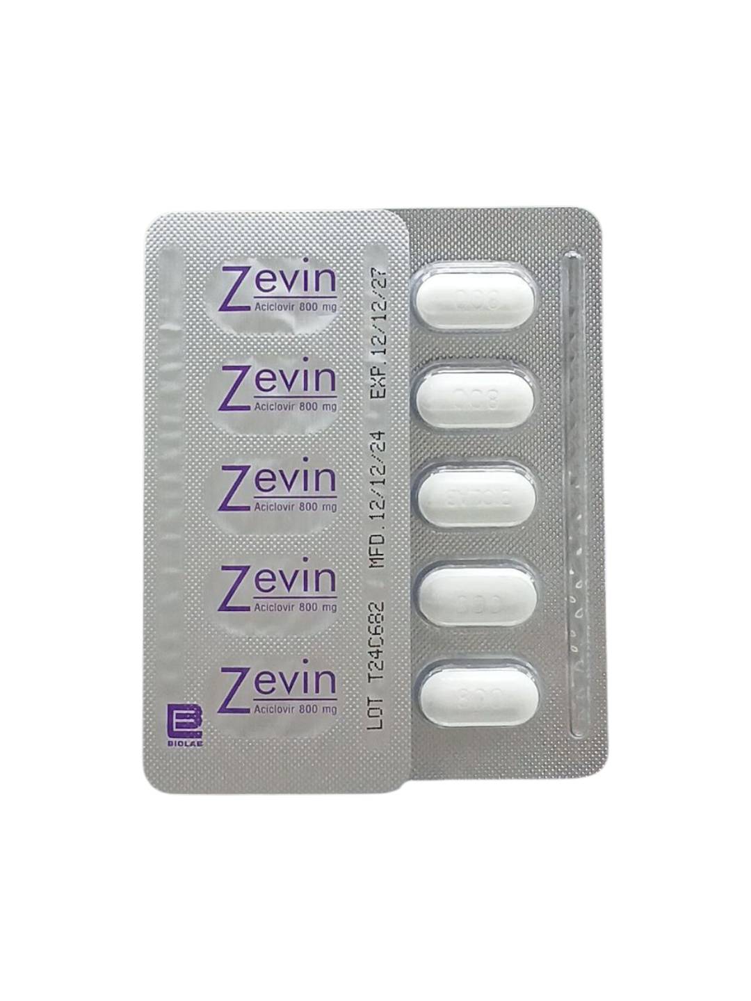 Zevin 800 mg เป็นยาต้านไวรัส บรรจุ 5 เม็ดต่อแผง ใช้เพื่อรักษาการติดเชื้อไวรัสเริม งูสวัด และอีสุกอีใส ภายใต้คำแนะนำของแพทย์หรือเภสัชกร